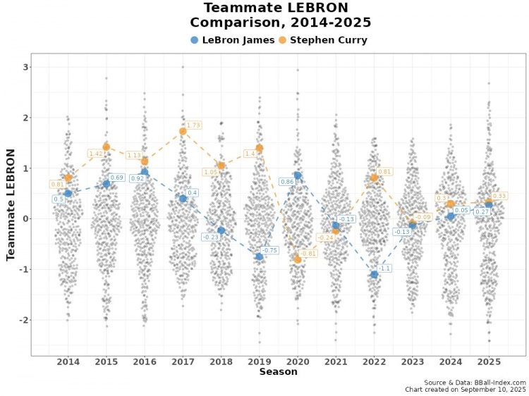 9月12日讯 近日,数据媒体BBall-Index晒图比较了2014-2025年期间詹姆斯和库里的队友强度。