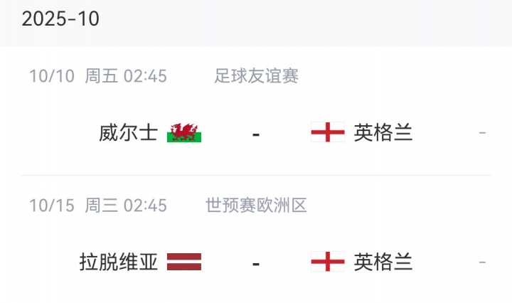 英格兰本月赛程↓
