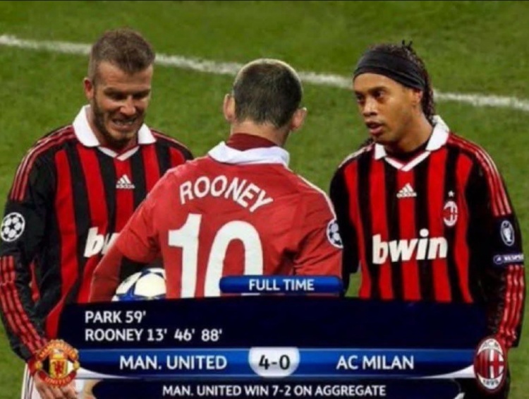 尴尬的是,这张图片是一张P图。2009-10赛季欧冠1/8决赛次回合,曼联确实4-0击败了米兰,但是鲁尼在那场比赛打进2球,另外两球是朴智星和弗莱彻打进,而且米兰那场比赛身穿的是黑色球衣,也不是图片里的红黑间条衫。