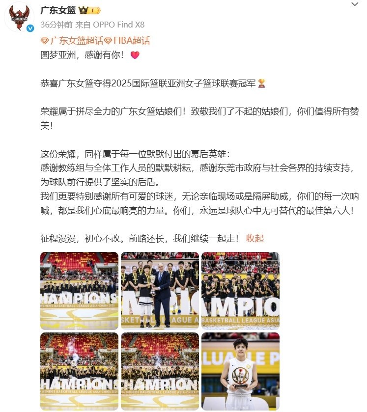 恭喜广东女篮夺得2025国际篮联亚洲女子篮球联赛冠军
