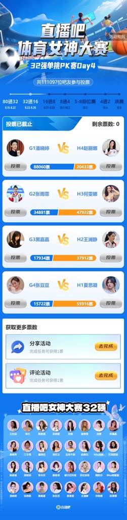2025年『体育女神大赛』32强单挑PK赛最后一日结束,淘汰赛Day4(G组、H组)结果如下: