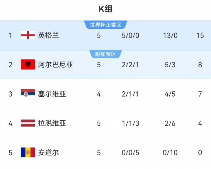 世预赛欧洲区K组积分榜↓