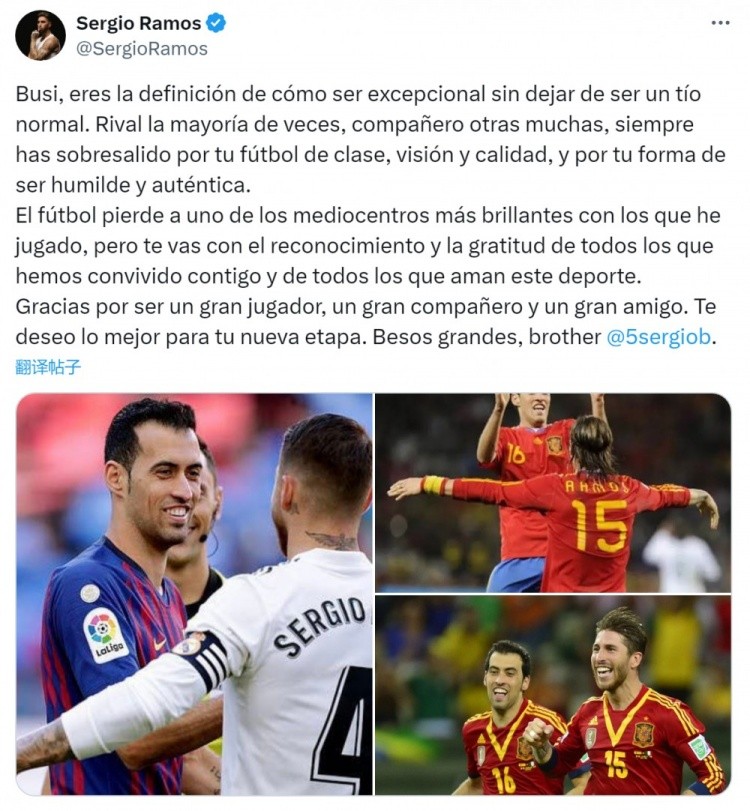 9月26日讯 西班牙中场布斯克茨宣布赛季结束后退役,拉莫斯社媒发文,为他送上祝福。